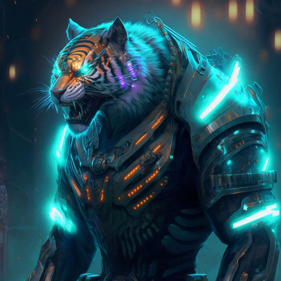 Футуристический дизайн в стиле киберпанк. Неоновые полосы тигра светятся синим и розовым. Отсылка к азиатской культуре и новому году Тигра. Популярен среди фанатов научной фантастики.