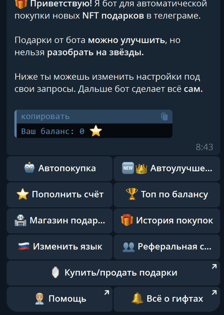 Покупка НФТ-подарков за Telegram Stars остается самым доступным способом для новичков. Процесс не требует настройки криптокошельков и понимания блокчейн-технологий, что делает его привлекательным для широкой аудитории.