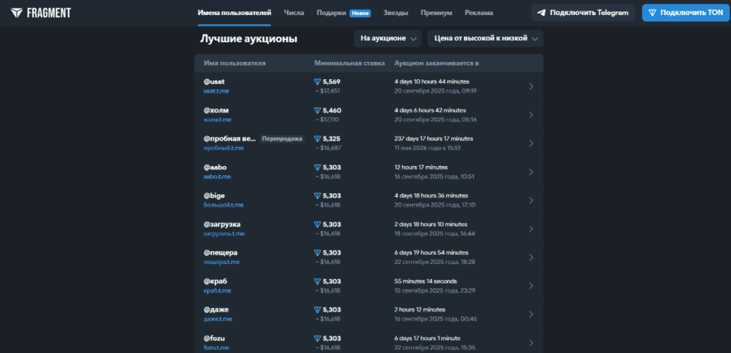 Цены — это отдельная история. Обычные длинные имена стартуют от десятков TON. А вот короткие или «говорящие» юзернеймы улетают за тысячи, а то и десятки тысяч токенов.