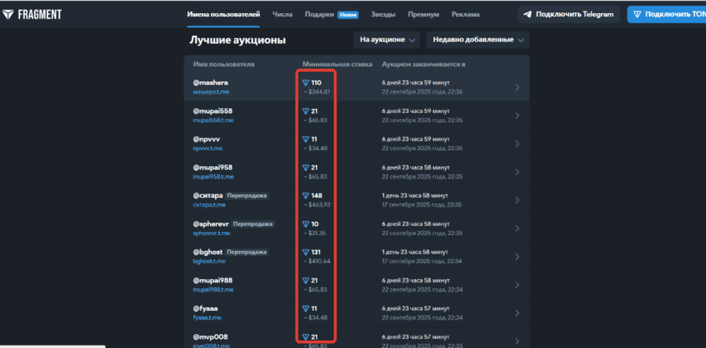 Покупка происходит на том же Fragment через систему аукционов. Находите понравившийся ник, изучаете текущую ставку и минимальный шаг. Делаете ставку через свой кошелёк и надеетесь, что вас не перебьют.