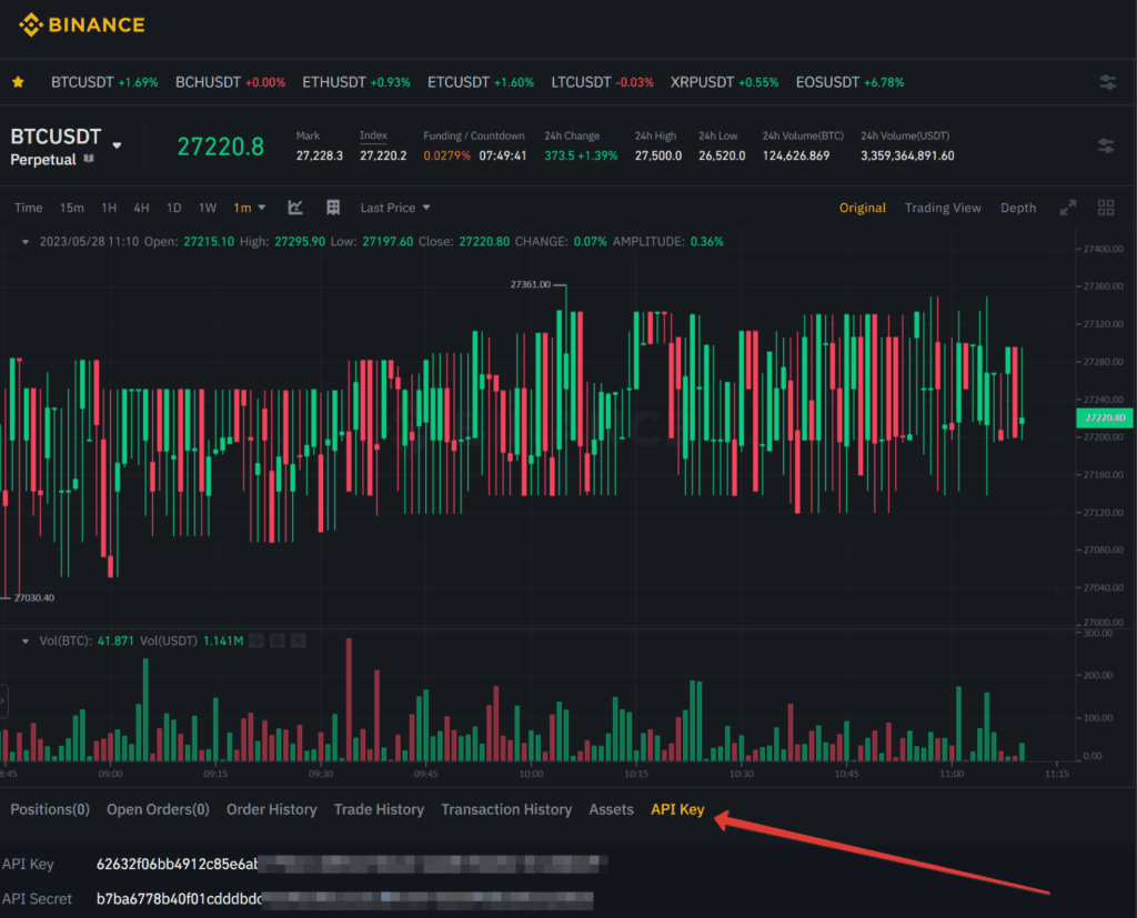 Binance Testnet: график и вкладка Positions