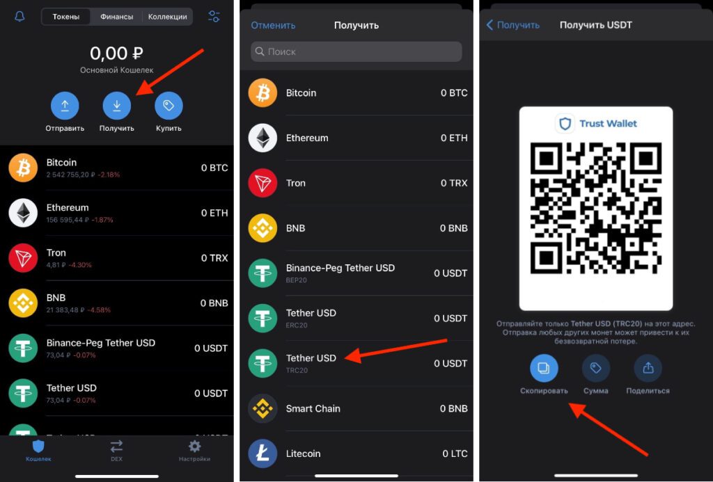 • Используйте кнопку «Получить», чтобы получить адрес кошелька для пополнения.