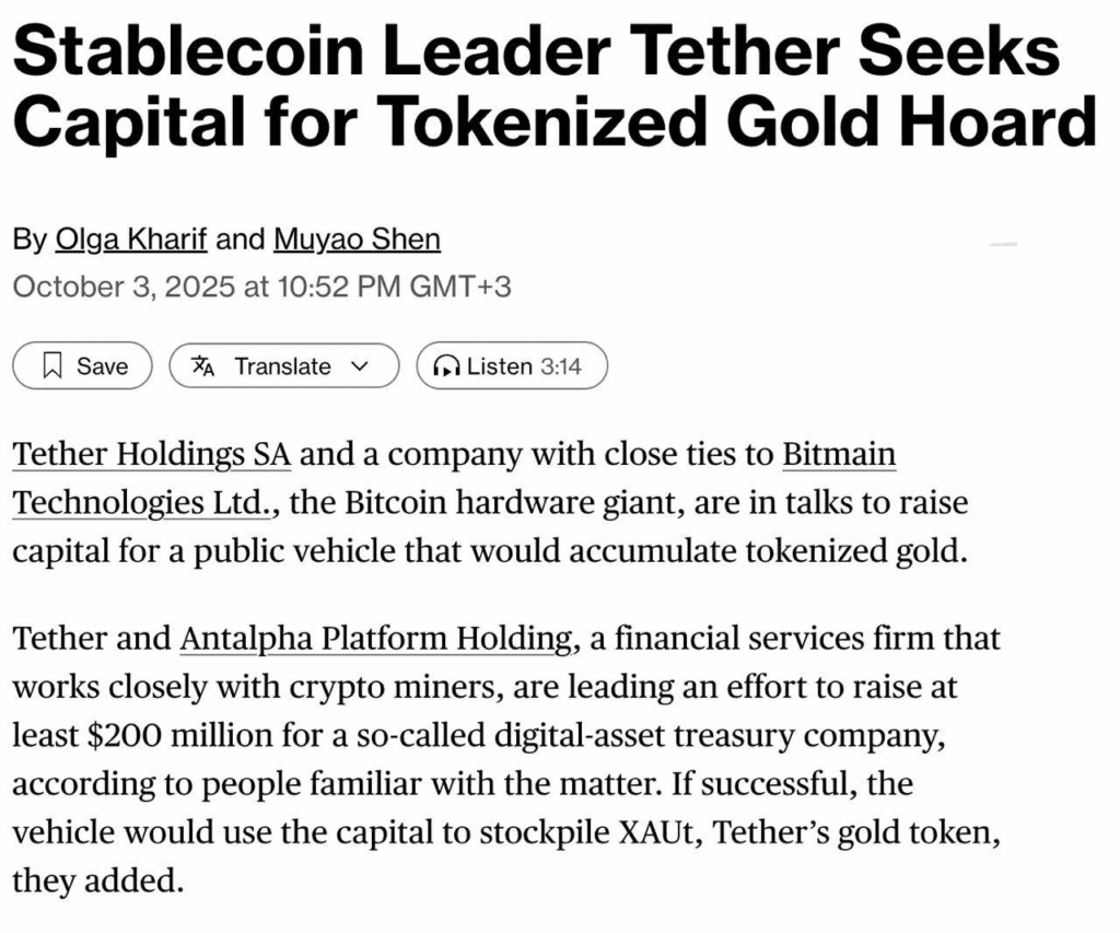 Компании Tether и Antalpha намерены совместно инициировать привлечение порядка $200 000 000 для создания финансового инструмента, цель которого — аккумулировать токенизированное золото, представленное токеном XAUT. Инициатива носит стратегический характер и может укрепить позиции Tether на рынке цифровых активов с привязкой к реальным активам.